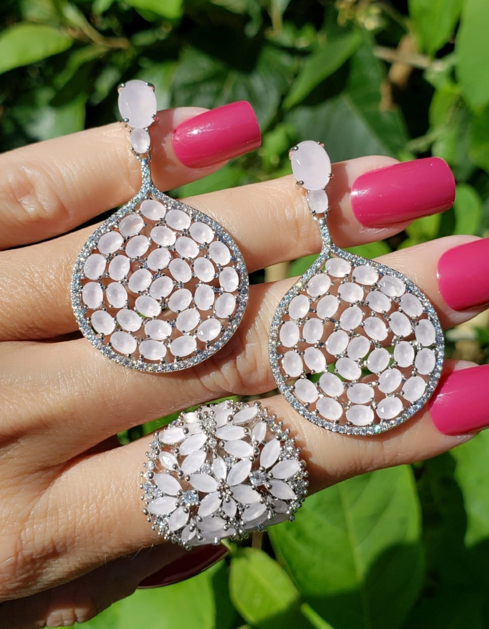 Brinco festa oval com zircônia rosa leitosa em banho de ródio branco banho zircônia colar branca cristal Ágata hematita ponto pulseira dourada luxo premium exclusivo elegante sofisticado tendência