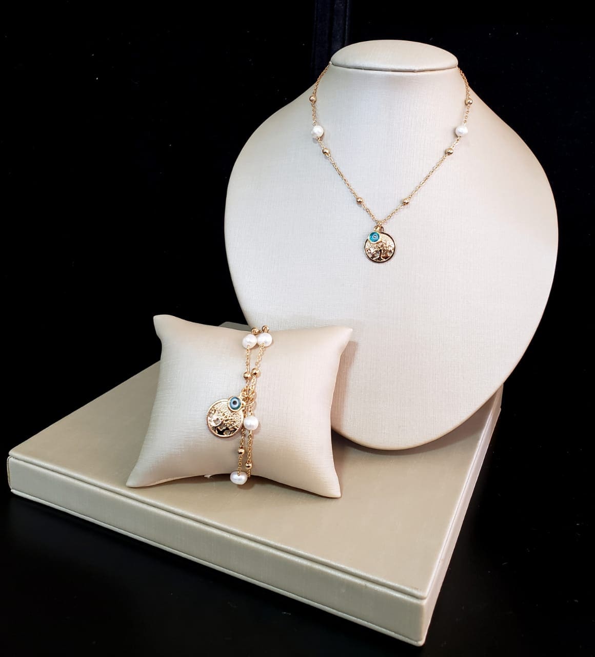 Colar 35cm com bolas, pérola de água doce, árvore da vida e olho grego em banho de ouro 18k banho zircônia colar branca cristal Ágata hematita ponto pulseira dourada luxo premium exclusivo elegante sofisticado tendência