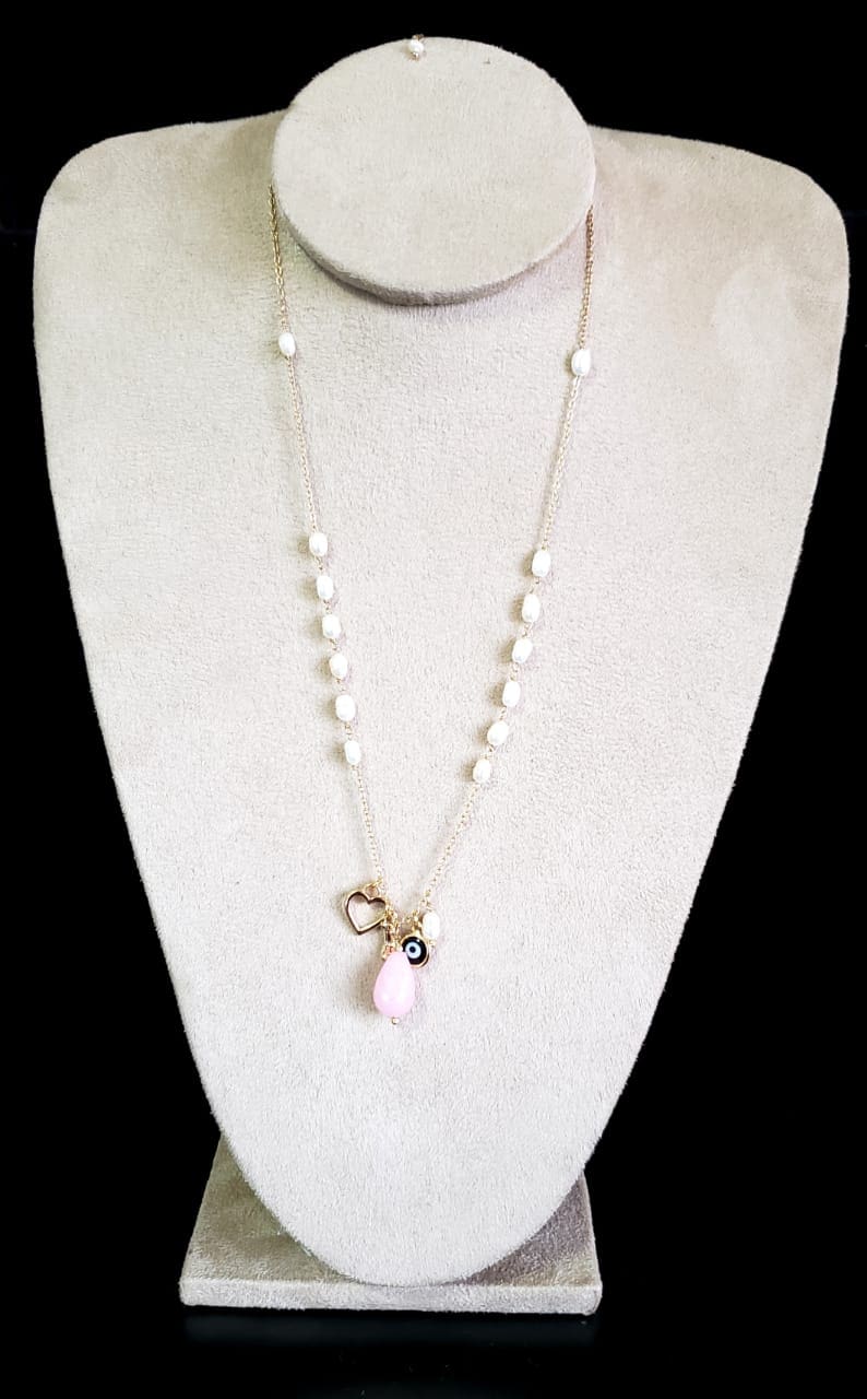 Colar 50cm com pérola de água doce e patuá com jade rosa em banho de ouro 18k banho zircônia colar branca cristal Ágata hematita ponto pulseira dourada luxo premium exclusivo elegante sofisticado tendência