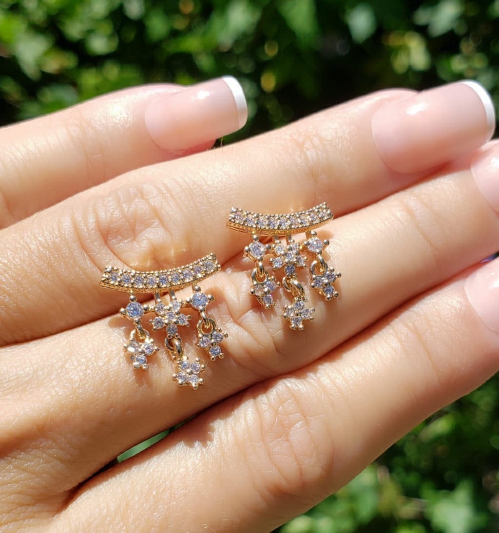 Brinco Mimo com Flor de zircônia branca em banho de ouro 18k banho zircônia colar branca cristal Ágata hematita ponto pulseira dourada luxo premium exclusivo elegante sofisticado tendência