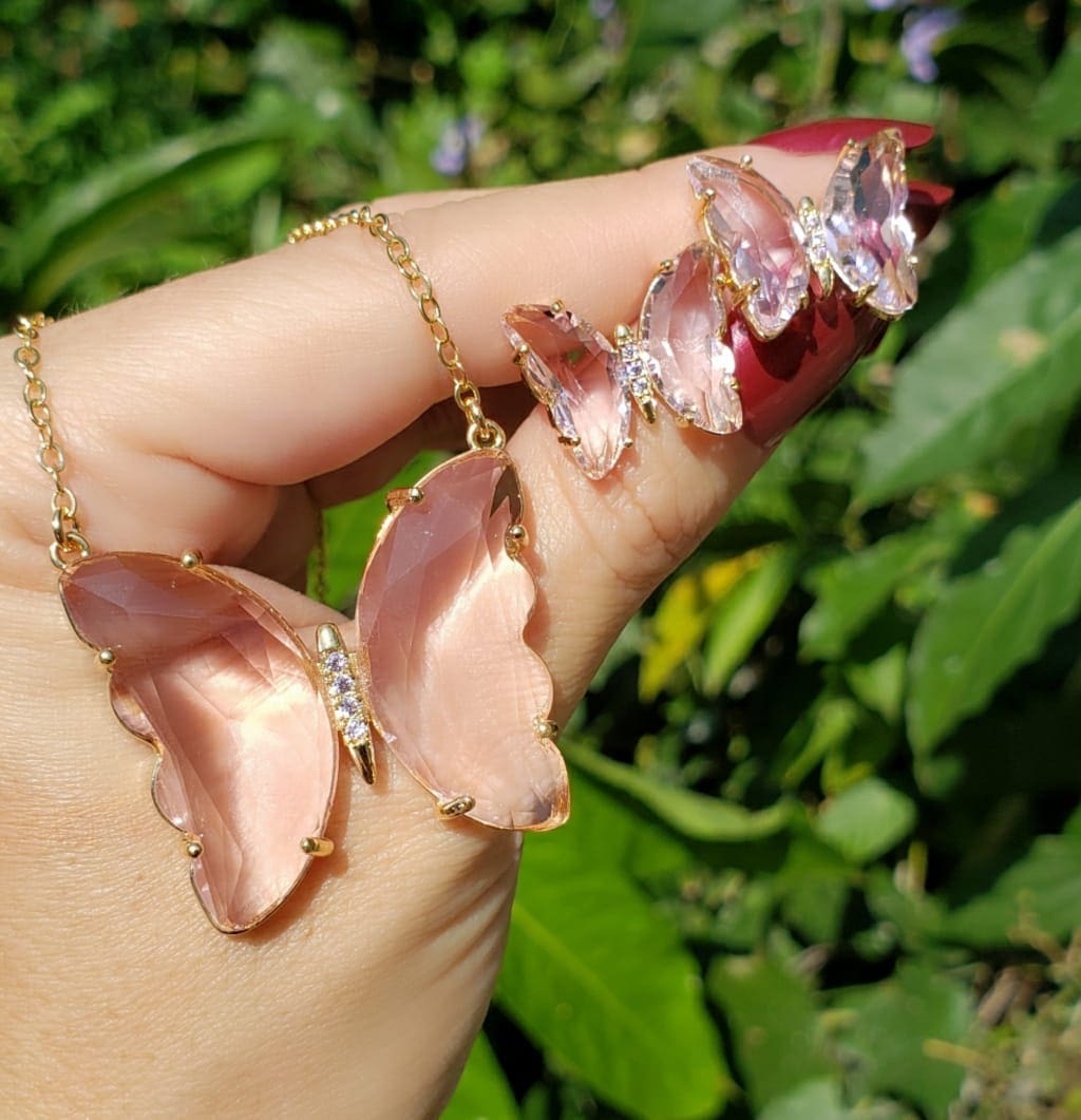 Conjunto Brinco e Colar Borboleta luxo com zircônia Rosa Claro em banho de ouro 18k banho zircônia colar branca cristal Ágata hematita ponto pulseira dourada luxo premium exclusivo elegante sofisticado tendência